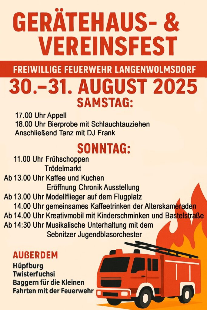 Gerätehaus- & Vereinsfest 20. August 2025 Start date: 30. August 2025End date: 31. August 2025Time: 17:00Location: Gerätehaus